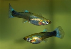 ![]() ![]() ![]() For the scientist, the genotype of a species is important to understand which heredity mechanisms are active and which are applicable in these fish. For the guppy breeder the phenotype of the guppy is important, in order to have a better understanding of what is behind the physical appea-rance of the fish: setting up a kind of genetic passport with the connection between phenotype and genotype, enables him to breed more targeted and to breed more beautiful guppies. The knowledge of genetics may have a practical function and purpose for the guppy breeder, but at the same time it makes the breeding of guppies doubly interesting. A mutual exchange and stimulation takes place between the two knowledge areas. As an 11-year-old child I found this double satisfaction in breeding guppies: (trying to) crack one of the "secrets" of nature, and also breeding beautiful fish. But in my case, the decisive factor of this double interest lies in the last case: it comes down to "translating" the principles of genetics to the "case" of the guppy. So, not an essay on genetics here, but rather an attempt to explain the gup's genetics passport in manageable language and mecha-nisms. The guppy is at the same time a very grateful subject for this: it is not without reason that it owes its name of million fish or rainbowfish to its extensive variety of shapes and colors. With its rich genetic potential, and the direct connection with the physical effect, it is therefore an excel-lent study object. But this also makes it a difficult study, due to its com-plexity and variety-richness. Hence my contribution here to make this guppy maze a bit more comprehensable and clearer. With this remark: I do NOT follow "the usual ways" of science, but my own lines of thought and insights, from my many years of practice with guppies and my more prag-matic approach. No scientific jargon here, but a new, fresh, DIFFERENT view. ![]() ![]() ![]() ![]() ![]() ![]() ![]() ![]() Everything starts with the wild guppy as it developed himself for decades in Central America, and was imported here as an aquarium fish. In 1957, the guppies I had got from someone as a child were not that different from the original wild-caught. Aquarium science was only at the beginning of its development for the majority of citizens at that time. The frame aquariums could still leak, and the technology was still rudimentary: witness a ther-mostat that dit not stop anymore the heater and did boil all the fish in my father's aquarium (an incident that immediately ended his hobby). Now that guppy in the wild must have had to conform to two contradictory tendencies for centuries: firstly, not being conspicuous with a camouflage color to avoid being eaten as a small fish; and secondly, to yet stand out - for the males than - to impress and seduce females. See: here for more details. The natural selection thus maintained a gup, of which the ground color (!) and the females were gray, and the males with a number of color spots to attract the attention of the females. The habitat of guppies are shallow pools and swamps, where they hunt small larvae and insects; hence their reputation as mosquito larvae killers . I was reminded of this when I found a nephew of the guppy, more specifically the gambusio , in a lake in the south-west of France in the late 1960's. Those mosquitofish lived in the reeds in shallow water where the temperature could reach 36 ° C during the day and drop to 10 ° C at night. Like the guppy, it is an opportunist and survivor, capable of withstanding cloudy or brackish water (with a salt content) and temperature differences. But unlike its cousin, it never made it to become a celebrated aquarium fish due to its lack of color and social behavior towards other fish species. ![]() ![]() ![]() ![]() ![]() With its entry as an aquarium fish, the guppy was no longer subject to the requirements of natural selection, but was subject to the wishes of the breeder. Initially it did not run that fast, and it was mainly bred on the variability of its caudal fin shape, and various standard shapes were drawn up: the old guptypes as lower sword, top sword, double sword, lyre tail, spatula tail, flag tail, veil tail, triangle tail. The color and the drawings were typified in "lyric" descriptions: the chainguppy with a dark zigzag line on the body; the bird-eye with black round spots; the lace-tail with a dark drawing in the caudal fin that therefore appears a-jour or lace-like. The origin of guppy clubs started in England, so that the first names are also in English: swordtail, lyretail, ...... Both the colors and these drawings show how these traits are "mapped" in the guppy's genes . What I find almost not in the (numerous) publications that have since appeared, is the emphasis that the effect of those genes is threefold : they determine the quantity, and the quality of the pattern (color, drawing), as well as its location . Below an example to make this clearer. It can be seen that both the orange color and the black spots - which I have presented here in 3 gene pairs each time - determine both the intensity and the frequency of color or spots: more genes expresses the trait more. Only one pair of genes: few and pale. Two pairs of genes: many and clear. Three pairs of genes: maximum and emphatic. I have found that EACH color also has a preferred area within which the spots or shades will preferentially occur. After all, with all those breeding products, one could think that any color can appear anywhere at random. But it is precisely the wild and old-fashioned guppies that show that each color will appear first in its preferred areas. The map at the very top of this article shows these preferred locations by color. Within a species, there is not only the interplay of all these physical (pheno-typic) variations as determined by the distinct genotypes, but also a balance between colors and drawings that are dominant , and colors and graphic